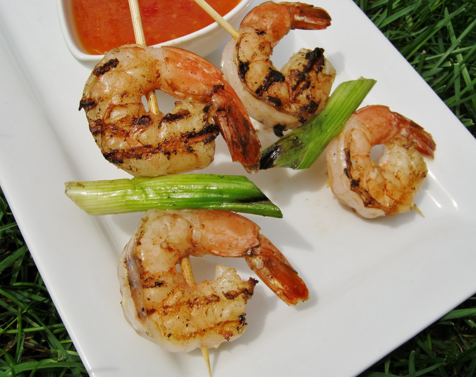 Garlic and Chili Shrimp Skewers, with tangy Thai dipping sauce on the side.